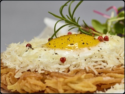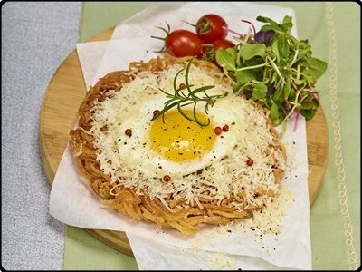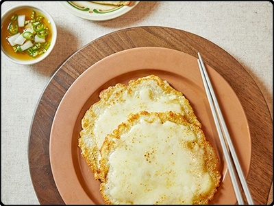 3. 팬 외곽에 식용유를 한 번 더 적당히 둘러주고, 뚜껑을 덮어 계란을 서서히 익혀주어요. 달걀 겉면이 익었을 때 뚜껑을 열고 식용유를 약간 두르고 중불로 맞춰 밑면이 바삭하게 그득히 구워주어요. 밑면에 색이 노릇하게 나면 접시에 담아 파슬리가루와 후춧가루를 뿌려 완성해요.
