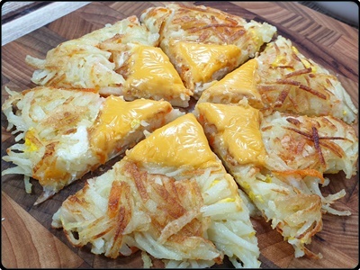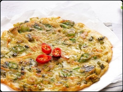 한쪽면을 뒤집기 전에 고추를 올리면 돼요. 감자전은 요렇게 노릇노릇해 질 때 까지 부쳐주시면 완성이고요. 정말 손 쉬워서 출중한 백종원 황금레시피 감자전 만드는방법이에요.
