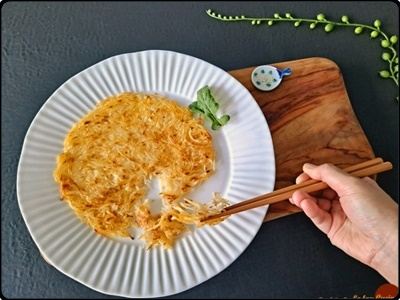 3) 팬에 기름을 두른 후 온도가 오르면 감자 반죽을 잘 펼쳐서 얹어주세요. 감자전을 뒤집어 가며 앞뒤로 노릇하게 구워주세요. 앞뒤로 노릇하게 부쳐주면 튀김가루 더해 더 바삭 쫀득한 감자전 완성이에요.
