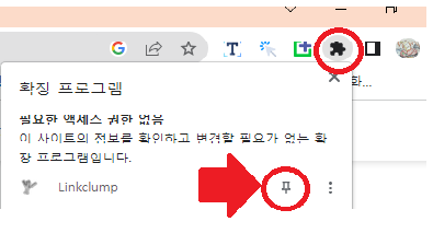 5. 크롬에 추가된 Linkclump를 활성화 하는 과정이 필요합니다. 크롬 브라우저 화면 오른쪽 상단에 퍼즐 모양의 아이콘을 클릭합니다. 그리고 이미 크롬에 추가된 확장프로그램 중 Linkclump의 오른쪽에 압정 모양의 아이콘을 클릭해 줍니다. 그렇게 하면 추가한 확장 프로그램이 크롬 브라우저 오른쪽 상단에 고정됩니다.