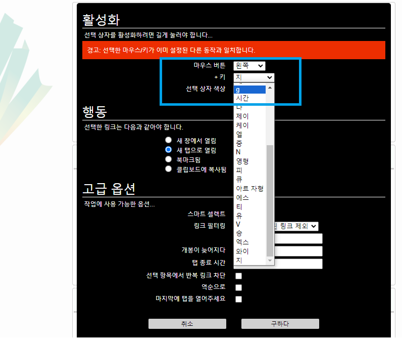 3. 마우스 버튼은 왼쪽, +키에서 사용할 키보드 키 값을 선택한 후 구하다(Save)를 클릭해 줍니다. 이렇게 설정하게 되면 설정된 키값과 마우스 버튼 왼쪽을 선택해서 드래그하면 추가 검색어가 크롬 브라우저 새창에 모두 열리기 됩니다.