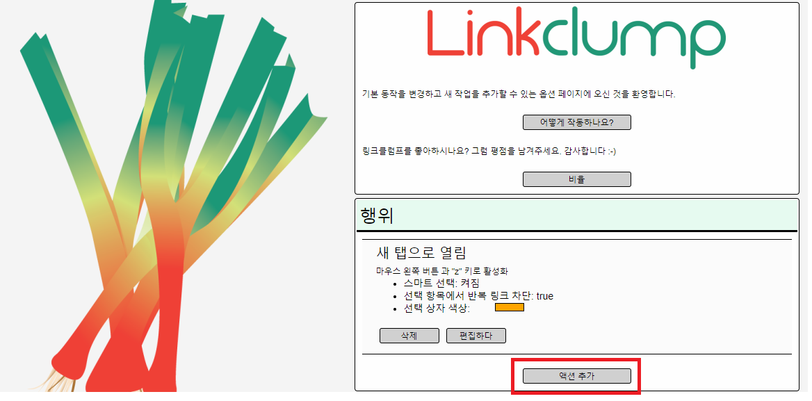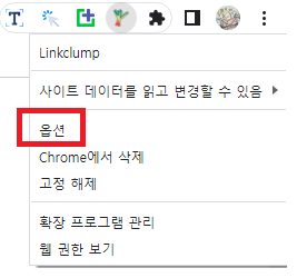 1. 크롬 브라우저 오른쪽 상단에 추가 및 고정된 linkclump 아이콘을 클릭합니다. 그리고 열리는 메뉴 항목중에서 옵션을 선택합니다.