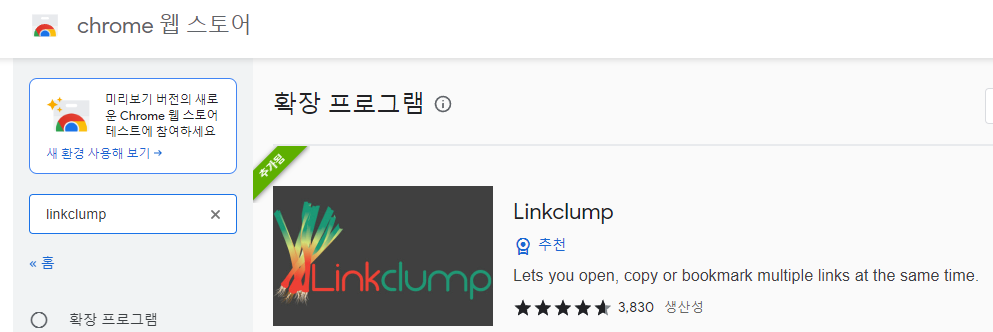 1. 우선 크롬 웹스토어를 실행합니다. 그리고 왼쪽 메뉴의 확장 프로그램 검색란에 linkclump를 입력한 후 검색해 봅니다.