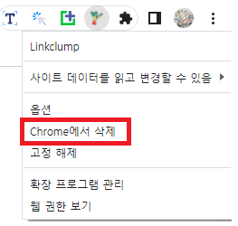 만약 추가된 linkclump를 삭제할 때는 고정된 linkclump 아이콘을 클릭합니다. 그리고 메뉴가 열리면 Chrome에서 삭제를 선택하면 추가된 프로그램을 삭제할 수 있습니다.