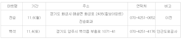 국군복지포털 사이트 공지사항을 통해 공유된 영외마트 11월 휴점 매장입니다. 경기도 화성에 위치한 전승마트는 이전으로 인해 11월 7일 휴점합니다. 그리고 경기도 양주에 위치한 백석마트의 경우 11월 4일 인근 도로공사로 인해 매장을 이용할 수 없으니 참고하셔도 좋을 듯 합니다. 전승마트 백석마트 휴점일 꼭 확인하시길 바랍니다.
