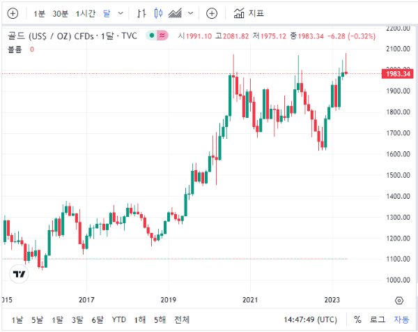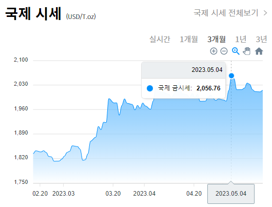 국제 오늘 금시세는 2023년 5월 4일 2056.76달러로 역대 최고값을 기록했습니다. 이는 국제 경제가 계속적으로 불안한 모습으로 금융시장마저 안정된 모습을 보이지 못하고 있기 때문으로 분석되고 있습니다.