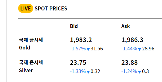국제 오늘의 금시세는 1,976.8달러로 전일대비 1.91% 하락한 금액대에 거래되고 있습니다. 그리고 28.66달러(1.42%) 하락한 수치로 매도 거래되고 있습니다. 2000달러가 돌파되고 역대급 금시세를 기록한 후 국제 금값시세는 2000달러가 무너지면서 전체적인 모습은 하락할 것처럼 보입니다.