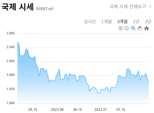 국제 오늘의 금시세는 1,936.29달러로 전일대비 비슷한 금액대에 거래되고 있습니다. 그리고 매수가와 비슷한 가격으로 매도 거래되고 있습니다. 지난 5월 초 사상 최고치인 2000달러를 돌파해서 상승을 이어갔던 국제 금값시세는 역대급 금시세를 기록한 후 5월 중순이 후 2000달러가 무너지면서 지속적으로 하락하였습니다.