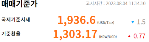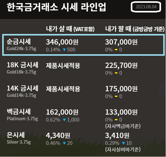 전반적으로 올해 상반기에 비해서 금시세 1돈가격이 조금 하락한 것으로 보입니다. 하지만 현재 한국금거래서 시세 라인업을 확인해보면 여전해 매도할때 오늘의 금값시세는 346,000원입니다. 그만큼 한번 오른 금의 가치는 높은 평가를 받고 있다는 것을 의미합니다. 금시세 1돈가격 2023년 8월 4일 오늘의 금값시세에 대해 자세히 알아보도록 하겠습니다.