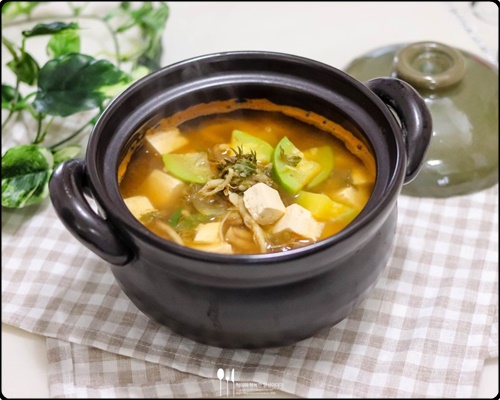 4) 준비된 육수에 냉이, 두부, 조개류, 대파, 마늘을 제외한 모든 재료를 넣고 한소끔 끓입니다.
