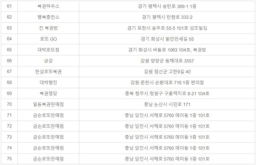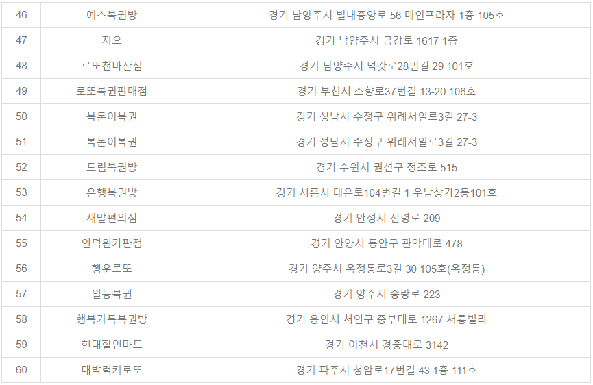 경기지역의 경우에는 자동판매대에서 2곳이 1등이 당첨되었습니다. 서울지역의 경우 자동 2곳, 수동 2곳, 반자동 1곳에서 1등이 당첨되었습니다. 이번 1061회 차에는 서울과 경기지역에 위치한 판매점에서 1등이 당첨되었습니다.