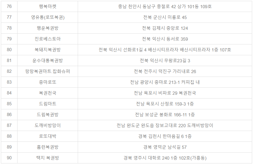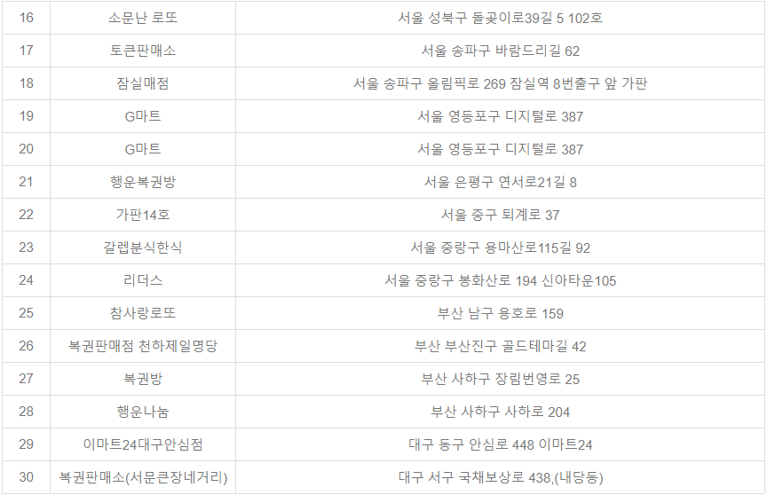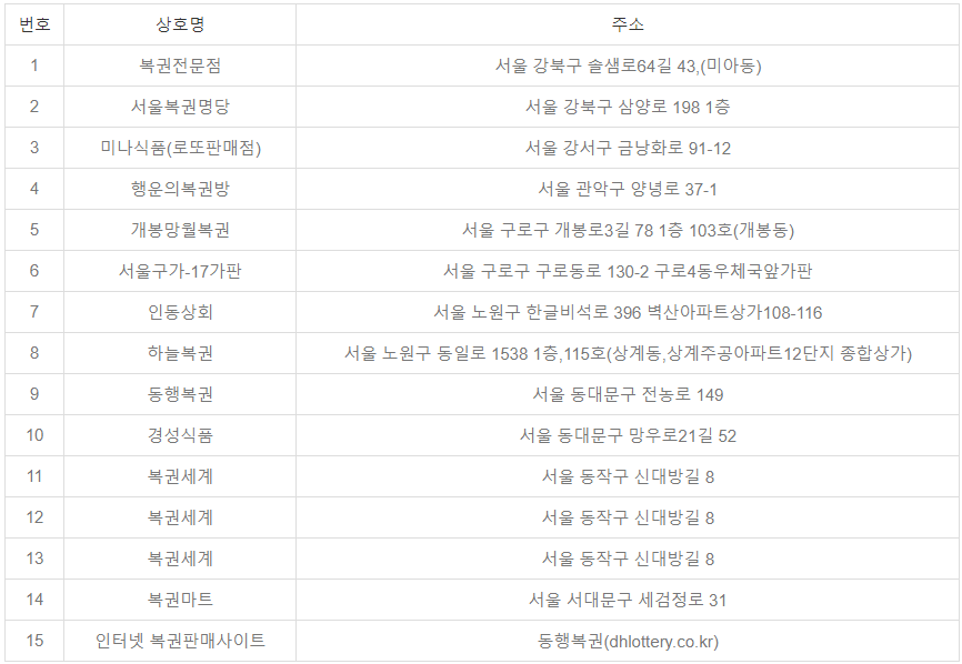 | 2 | 초대박 복권방 | 반자동 | 서울 강서구 곰달래로 184 1층 101호 |