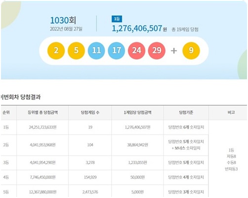 1061회 로또 당첨 번호 6개를 모두 맞추게 되는 1등에게는 각각 24억 2276만 8773원이 지급됩니다. 그리고 당첨번호 5개와 보너스 숫자를 맞춘 2등 99명은 각각 당첨금은 4486만 6089원을 받게 됩니다. 당첨번호 5개 숫자가 일치한 3등 3003명에게는 각각 147만 9102원이 지급됩니다.