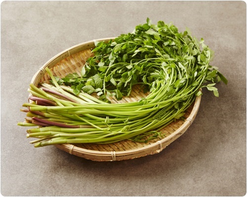 초록색을 띄는 미나리에는 퀘르세틴, 캠프페놀이라는 항산화 물질이 함유되어 있습니다. 이러한 성분은 신체의 염증을 억제시켜 주고 암 예방 및 치료 효과가 있다고 합니다. 이 성분은 특히 미나리를 데쳤을 때 소량의 소금을 넣고 데치게 될 경우 그 함량이 60%가량 증가한다고 합니다.