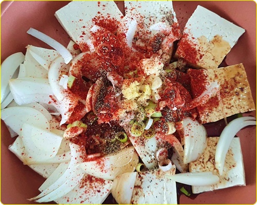 1) 두부 요리를 하기 전 가장 중요한 과정의 하나로 물기를 빼야 합니다. 뜨거운 프라이팬에 두부를 넣고 부치는 동안 뜨거운 기름이 많이 튀기 때문입니다. 그래서 가장 먼저 두부를 채에 올려 물기를 빼줘야 합니다.