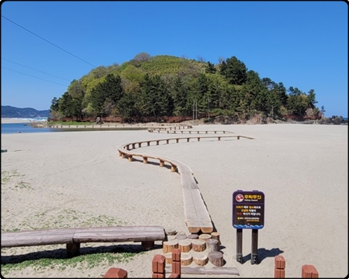 덕봉산 중턱에 가면 해안생태탐방로가 있습니다. 해안 코스 626m, 정상으로 이어진 내륙 코스 317m 정도로 조성되어 있습니다. 시계 방향으로 탐방로를 따라가다 보면 마읍천을 만날 수 있고 마읍천에 놓인 나무다리를 건너면 맹방해수욕장으로 이어지는 길을 만날 수 있습니다. 산과 바다 그리고 마읍천을 한눈에 볼 수 있습니다.