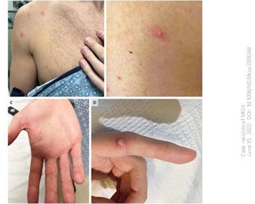 2022년 5월 이후 비풍토병 국가에서 유행 중인 사례는 이전 엠폭스 증상과는 차이가 있습니다. 발진 전 발열 등의 증상이 없거나 발진 후에 발열 증상이 나타나기도 합니다. 특히 특정 부위인 항문생식기에 발진 수가 5개 미만으로 나타나기도 합니다. 그리고 구강 점막 궤양, 안구 통증, 항문궤양, 항문직장 통증, 이급후증 등을 동반하는 사례가 다수 보고되고 있습니다.