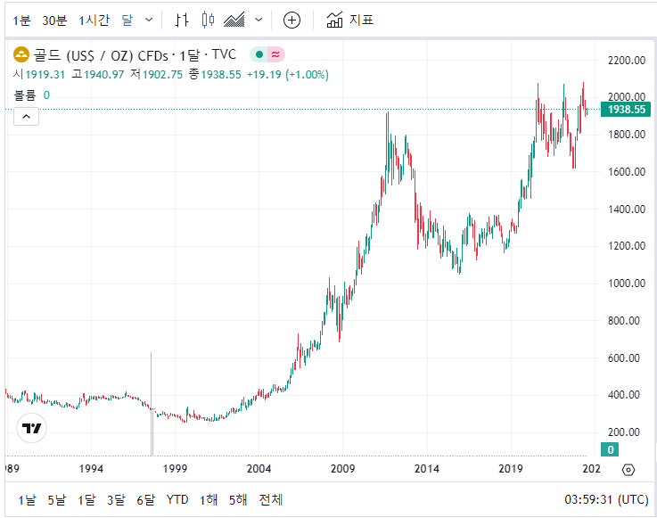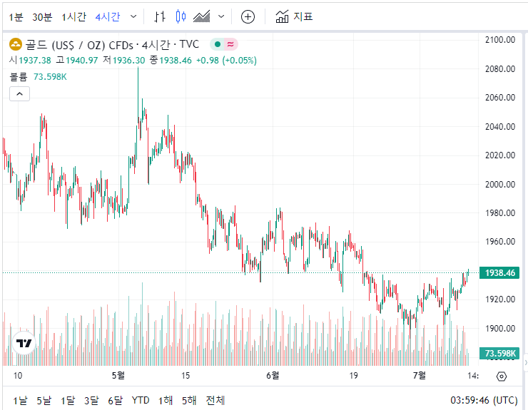 국제 오늘의 금시세는 1939.39달러로 전일대비 0.74% 상승한 금액대에 거래되고 있습니다. 그리고 14.43달러(0.75%) 상승한 수치로 매도 거래되고 있습니다. 2000달러까지 상승을 계속하면서 역대급 금시세를 기록했던 국제 오늘 금시세 1돈가격은 2000달러가 무너지면서 지속적으로 하락하였습니다. 그리고 6월 말부터는 하락을 멈춘듯 보입니다.