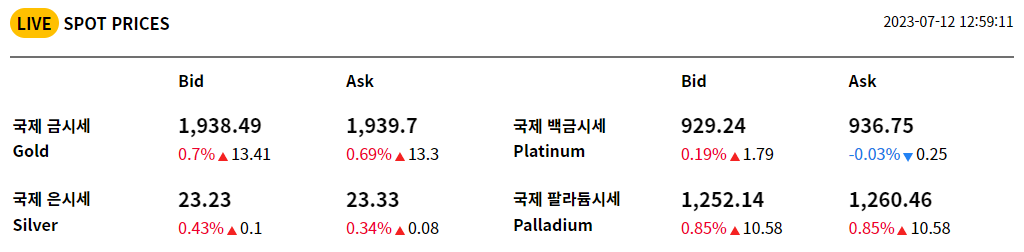 7월 12일 국제 금시세는 T.oz(약31.1g)당 1937.39달러였습니다. 이 수치는 전일대비 12.31달러 상승한 가격입니다. 반면에 오늘 국내 금시세는 13.09원 (0.02%) 상승했습니다. 2000달러가 무너진 국제 금값시세 2023년 7월 12일 오늘 금시세 1돈가격 그리고 팔때 순금시세 에 대해 정리해 보도록 하겠습니다.