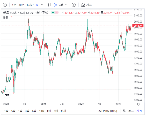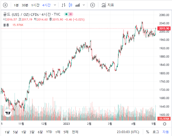 국제 오늘 금시세는 2023년 4월 14일 2039.23달러로 여전히 최고값을 기록하고 있습니다. 이는 지속적인 금융시장의 불안감과 더불어 달러 약세가 이어지는 상황이 계속되면서 투자자들이 안전 자산에 몰리기 때문일 것으로 보입니다.