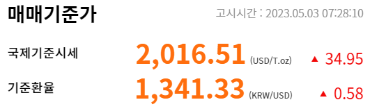 국제 실시간 금시세는 1T.oz(약31.1g) 당 2,016.51달러로 전일대비 34.95달러 상승했습니다. 그리고 기준환율은 1달러에 1,341.33원으로 전일대비 0.56원 상승하였습니다.