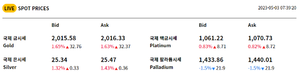 전반적으로 국내의 순금시세, 18K 금시세, 14K 금시세는 모두 전일대비 동일한 가격으로 거래되고 있습니다. 한국금거래소 실시간 국제 오늘의 금시세를 확인해 보도록 하겠습니다.