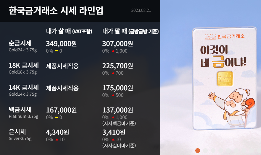 전반적으로 올해 상반기에 비해서 금시세 1돈가격이 조금 하락한 것으로 보입니다. 하지만 현재 한국금거래서 시세 라인업을 확인해보면 여전해 매도할때 오늘의 금값시세는 346,000원입니다. 그