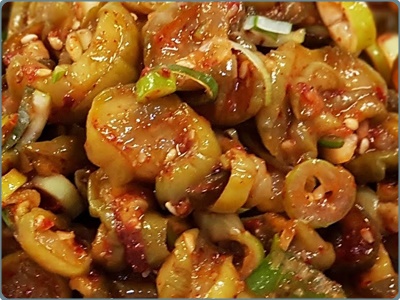 1) 담궈두었던 오이지를 잘라준 다음 물에 15분간 담가 둡니다. 이 과정은 짠맛을 사라지게 하기 위함이라고 합니다. 물에 15분간 담가 두는데 물은 2번 가량 갈아 주는 것이 바람직해요.