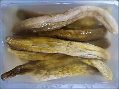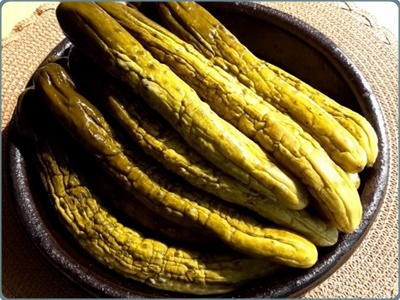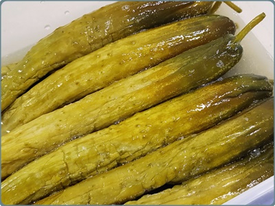 3) 오이지를 건져내시기 전에 미리 담가둔 오이지를 먹어보고 짠맛이 잘 제거되었는지 확인해야 하고요. 간이 알맞다고 생각되면 물에 담궈두었던 오이지의 물기를 삭제해야 하고요. 물에서 건져낸 오이지를 손으로 꽉 짜서할 수 있는 물기를 많이 빼줘요.