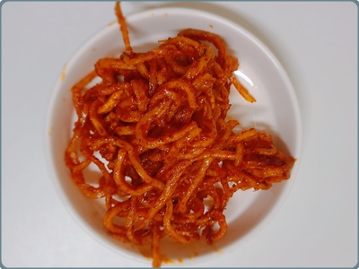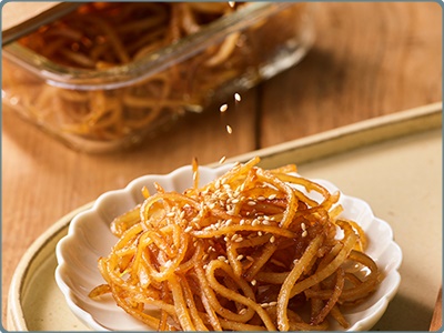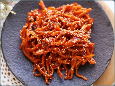 간장 진미채볶음은 달달함과 짭조름한 맛이 특징이에요. 고추장과 고춧가루 대신에 간장을 넣어서 요리하는 것이 특징이에요. 기본 양념인 올리고당과 간장으로 맛을 내는 것이 고추장 진미채볶음과는 확연한 차이가 있답니다. 간장 진미채볶음은 맵지 않고 단짠의 맛에 의하여 저녁 밑반찬으로 아주 좋답니다.