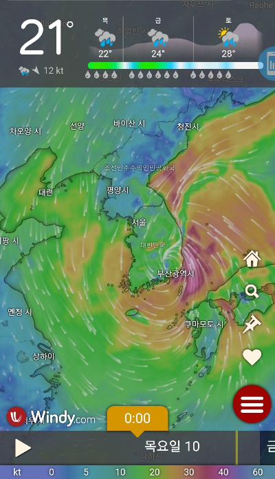 고속도로에서 100킬로 이상으로 달리는 자동차 위에 서 있을 때 느끼는 정도의 강풍이라고 합니다. 6호 태풍 카눈 예상경로, 7호 태풍 란 예상경로 및 바다에서 낚시를 하는 선단과 낚시꾼들이 많이 사용하는 날씨 어플 윈디에 대해 알아보도록 하겠습니다.