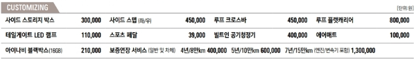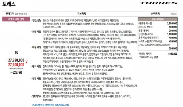 토레스는 T5, T7, TX 등급이 있습니다. 대략적으로 T5는 2830만 원, T7는 3150만 원, TX는 3524만 원 정도로 구매할 수 있습니다. 각각의 트림에 따라 추가할 수 있는 옵션이 정해져 있습니다. 인테리어 패키지는 T7 트림부터 추가가 가능하며 비용은 30만 원가량이 추가됩니다. 스마트 테일게이트 또한 T7부터 추가하실 수 있습니다. 토레스는 커스터마이징이 가능합니다. 스포츠 페달부터 20인치 단조휠까지 커스터마이징 범위가 넓고 각자의 취향에 맞게 차를 꾸며서 출고할 수 있습니다.