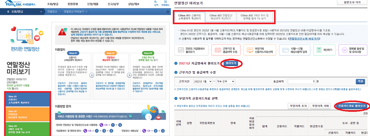 - 위 화면에 좌측의 Step. 01 신용카드 소득공제액 계산하기를 선택합니다.
